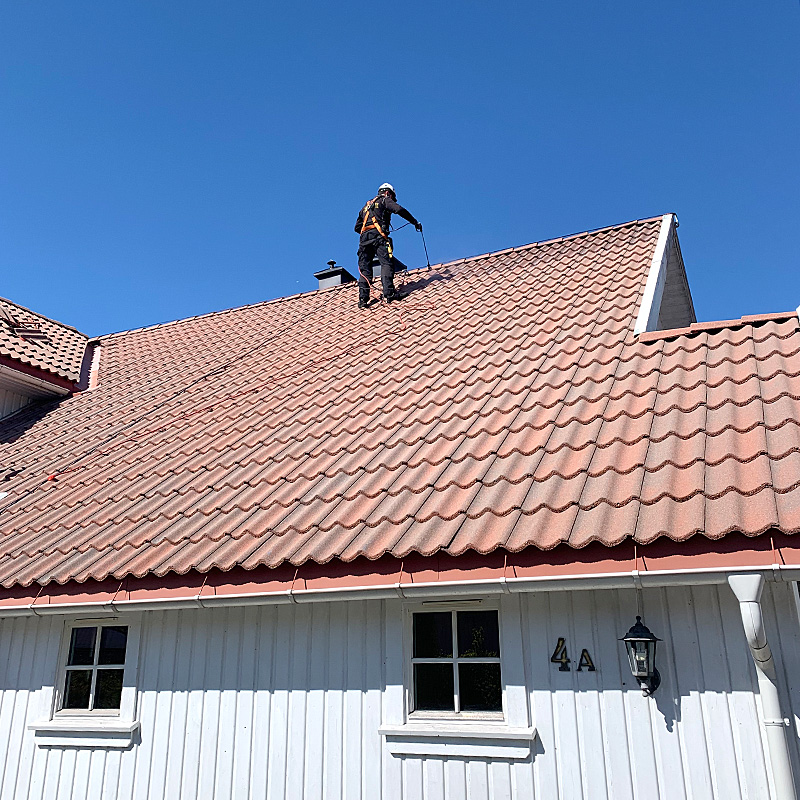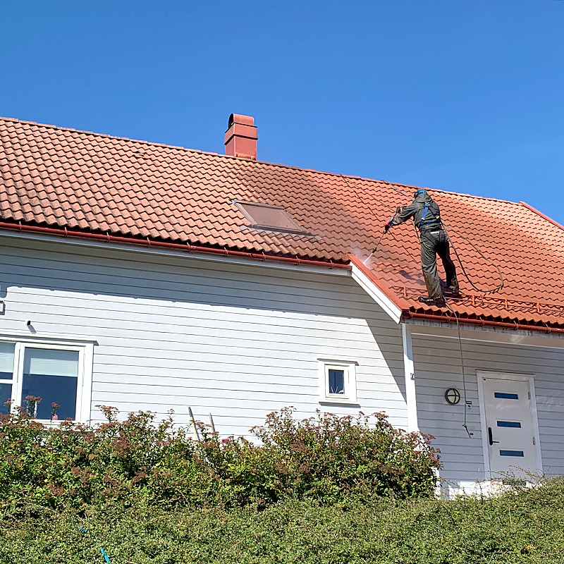 Deretter gjennomføres en grundig mekanisk vask med vanntrykk mellom 250–400 bar. Dette fjerner effektivt mose, alger og smuss. Samtidig renses takrenner og nedløp, og utsatte områder dekkes til. Ødelagt takstein byttes ut underveis, og fasader og uteområder rengjøres når arbeidet er ferdig.